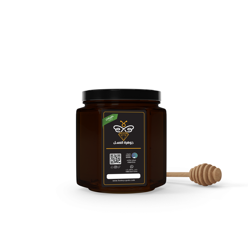 - لون بني غامق وكثافة فريدة تعكس جودة العسل.