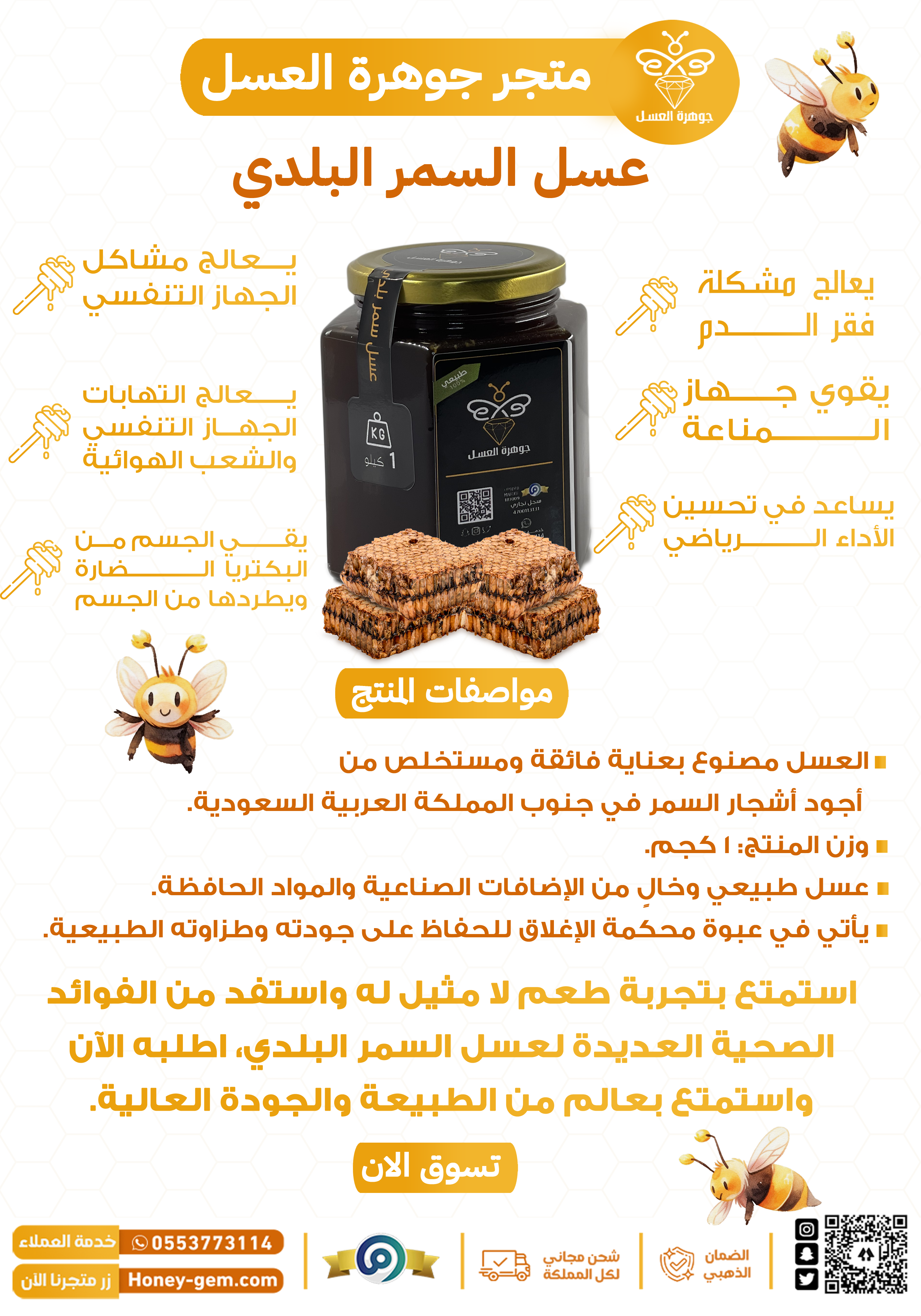 اكتشف روعة طبيعة السعودية في عسل السمر البلدي المميز على متجر جوهرة العسل. يعتبر هذا العسل من أجود أنواع العسل في المملكة، ويحتوي على فوائد صحية مذهلة. استمتع بتجربة فريدة واستفد من طبيعته العالية الجودة.